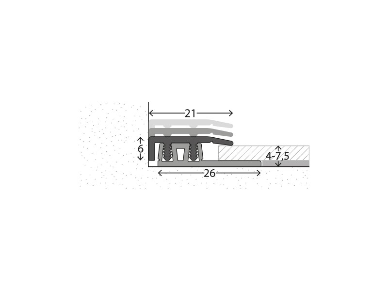 Die verzahnten Profilstege des Oberprofils rasten sicher in den trapezförmigen Aufnahmen des Basisprofils ein. Dabei kann das Oberprofil leicht verkippen und sich variabel in Höhe und Neigung dem Bodenbelag anpassen. Die schmalen, flachen Profile überzeugen durch eine besonders schöne Optik und bieten gleichzeitig großzügige Dehnungsfugen für die Dimensionsschwankungen des Bodenbelages.