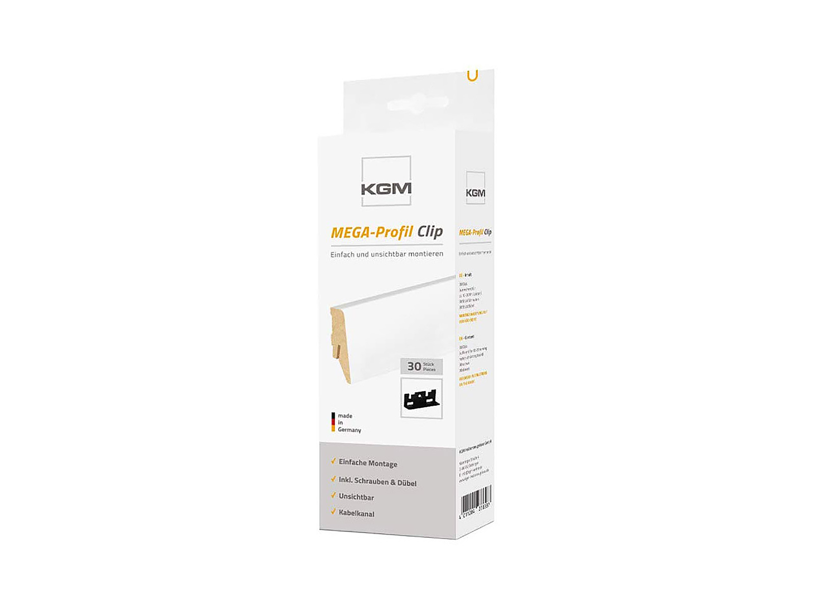 Die KGM Montageclips aus Kunststoff passen für alle Sockelleisten mit dem MEGA-Profil. Auch zu unserem Bestseller, der MEGA MDF Sockelleiste in Weiß mit den passenden Ecken und Abschlüssen. Du kannst die Clips mit den beiligenden Dübeln und Schrauben an die Wand schrauben. Im Anschluss steckst Du die Sockelleiste einfach auf die Montageclips. So lassen sich die Sockelleisten mit Clips befestigen - ganz ohne sichtbare Befestigungspunkte oder Beschädigungen der Fußleisten. Je nach Wandbeschaffenheit und Leistenlänge benötigst Du pro Leiste in etwa 4 bis 6 Clips, die im Abstand von ca. 40 bis 60 cm anzubringen sind. Der integrierte Kabelkanal bietet Dir ausreichend Platz für ein Standardstromkabel (max. 8mm Ø).