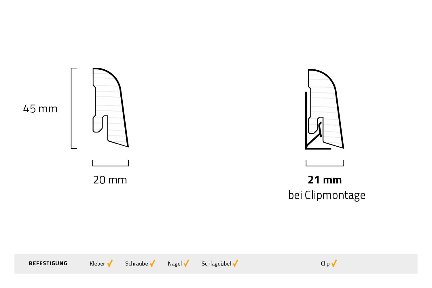 Nicht immer passt die sichtbare Kante bei Sockelleisten auch zum Ambiente eines Raumes. Deshalb haben wir auch Bodenleisten mit abgerundeter Kante für Dich im Programm, die optisch etwas weicher und weniger aufdringlich wirken. In Kombination mit dem Weißton ähnlich RAL-Wert 9016 die perfekte Wahl, wenn Du in Deinem Zuhause den unschönen Spalt zwischen Wand und Fußboden gezielt verstecken willst.