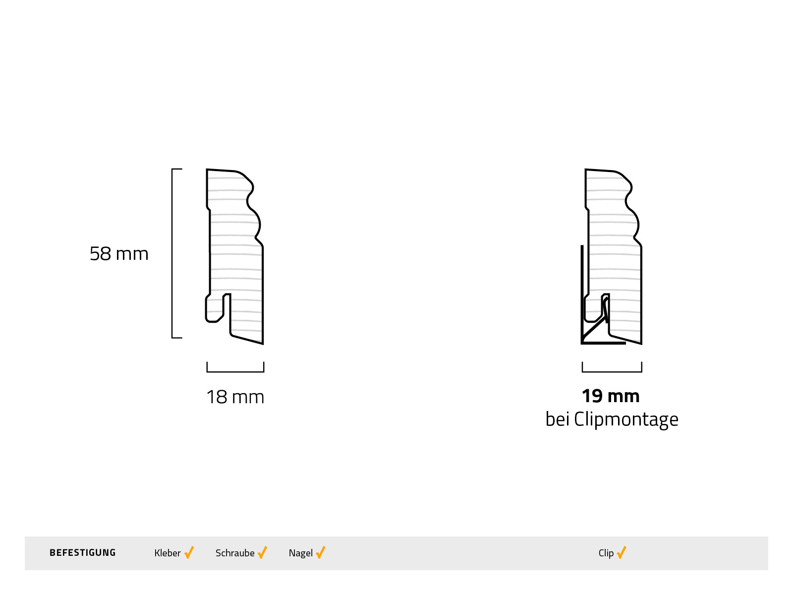Haben wir noch etwas vergessen? Ah ja stimmt, die Montage! Wenn Du störende Spalträume im Handumdrehen beseitigen willst, schaust Du am besten in unseren „Sockelleisten anbringen - Methodenübersicht“ Ratgeber. Dort findest Du eine Übersicht aller Methoden, der Vor- und Nachteile und genaue Anleitungen. Im How-To Ratgeber haben wir auch die typischen Fehler bei der Anbringung zusammengestellt, erzählen Dir alles über den Gehrungsschnitt und viele weitere, hilfreiche Texte / Videos.