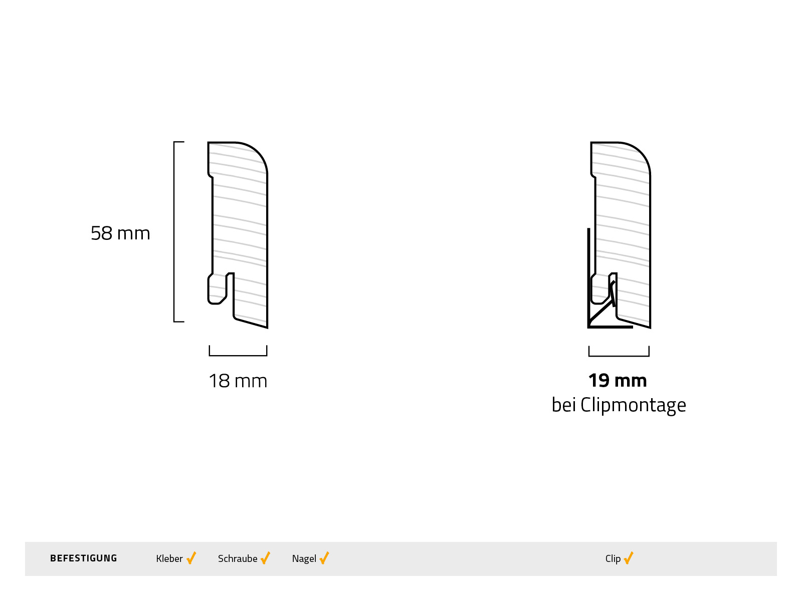 Und weil Geschmäcker – und Räume – verschieden sind, gibt’s diese Leiste gleich in drei Größen. Du willst’s dezent und unauffällig? Dann greif zur Variante mit 58 mm Höhe. Ein echter Allrounder, der sich auch in schmalen Fluren und kleineren Räumen wohlfühlt. Wenn’s etwas mehr sein darf, ist die 78 mm Ausführung genau richtig: klassisch, vielseitig und passt zu fast allem. Und für alle, die einen echten Hingucker setzen wollen, haben wir noch die 95 mm Variante im Sortiment – schön hoch, schön massiv, schön präsent. Alle Ausführungen haben eines gemeinsam: sie machen sich verdammt gut an deiner Wand.