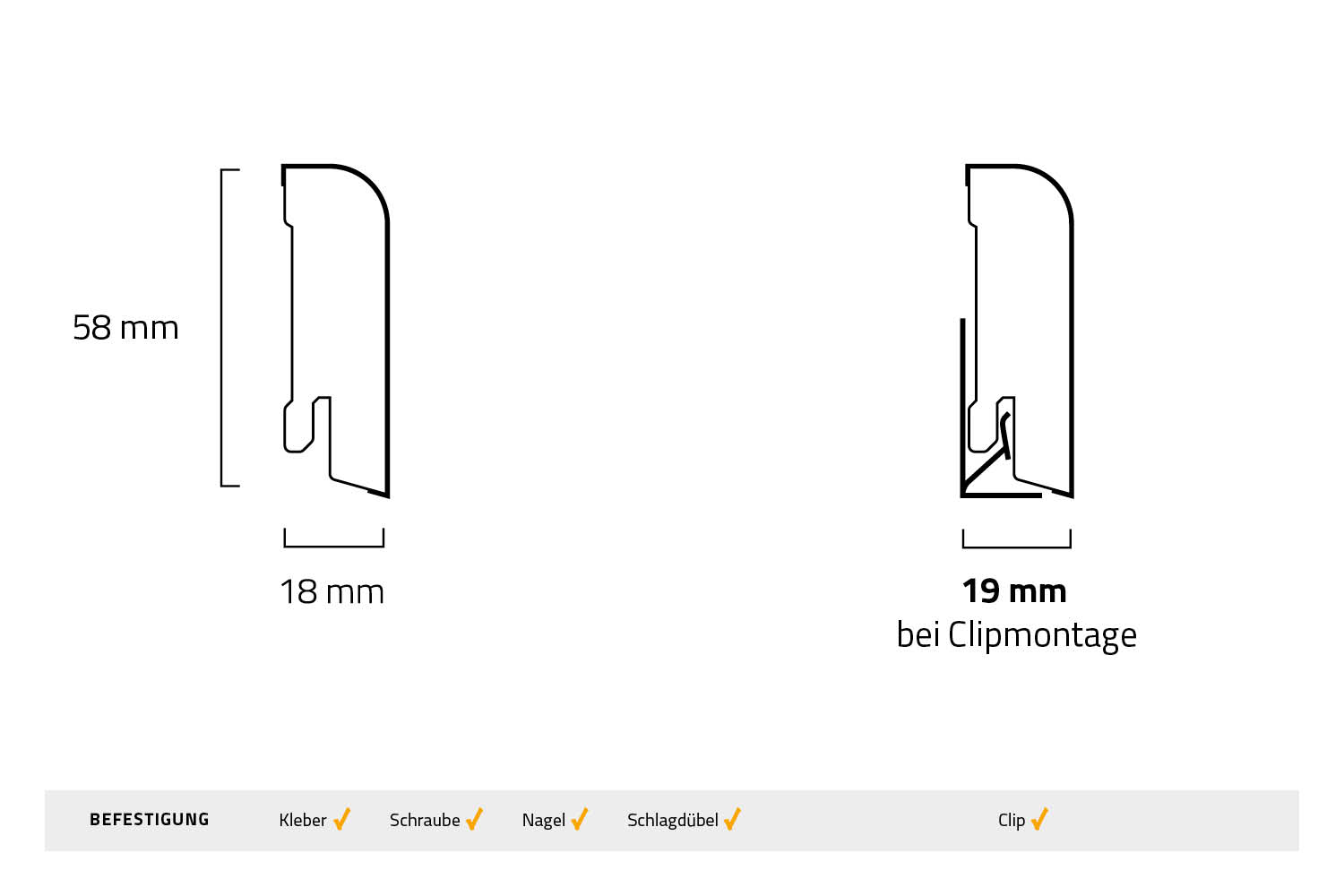 Um sicherzustellen, dass du für jedes Projekt die passende Größe findest, bieten wir die „Oben rund“ Sockelleisten in verschiedenen Maßen an. Die 18 x 58 mm Variante ist ideal für kleinere Räume oder Räume mit niedrigen Decken und sorgt für einen dezenten Abschluss. Die 18 x 78 mm Leiste eignet sich perfekt für mittelgroße Räume, da sie einen etwas markanteren Abschluss bietet, ohne aufdringlich zu wirken. Für größere Räume oder solche mit höheren Decken bietet sich die 18 x 100 mm Variante an, die ein starkes gestalterisches Statement setzt. Und für besonders hohe Räume oder Altbauten sorgt die 18 x 120 mm Sockelleiste für eine luxuriöse Note und einen eleganten Übergang zwischen Wand und Boden. Mit dieser Auswahl an Größen hast du die maximale Flexibilität, um jede Raumgestaltung perfekt abzurunden.