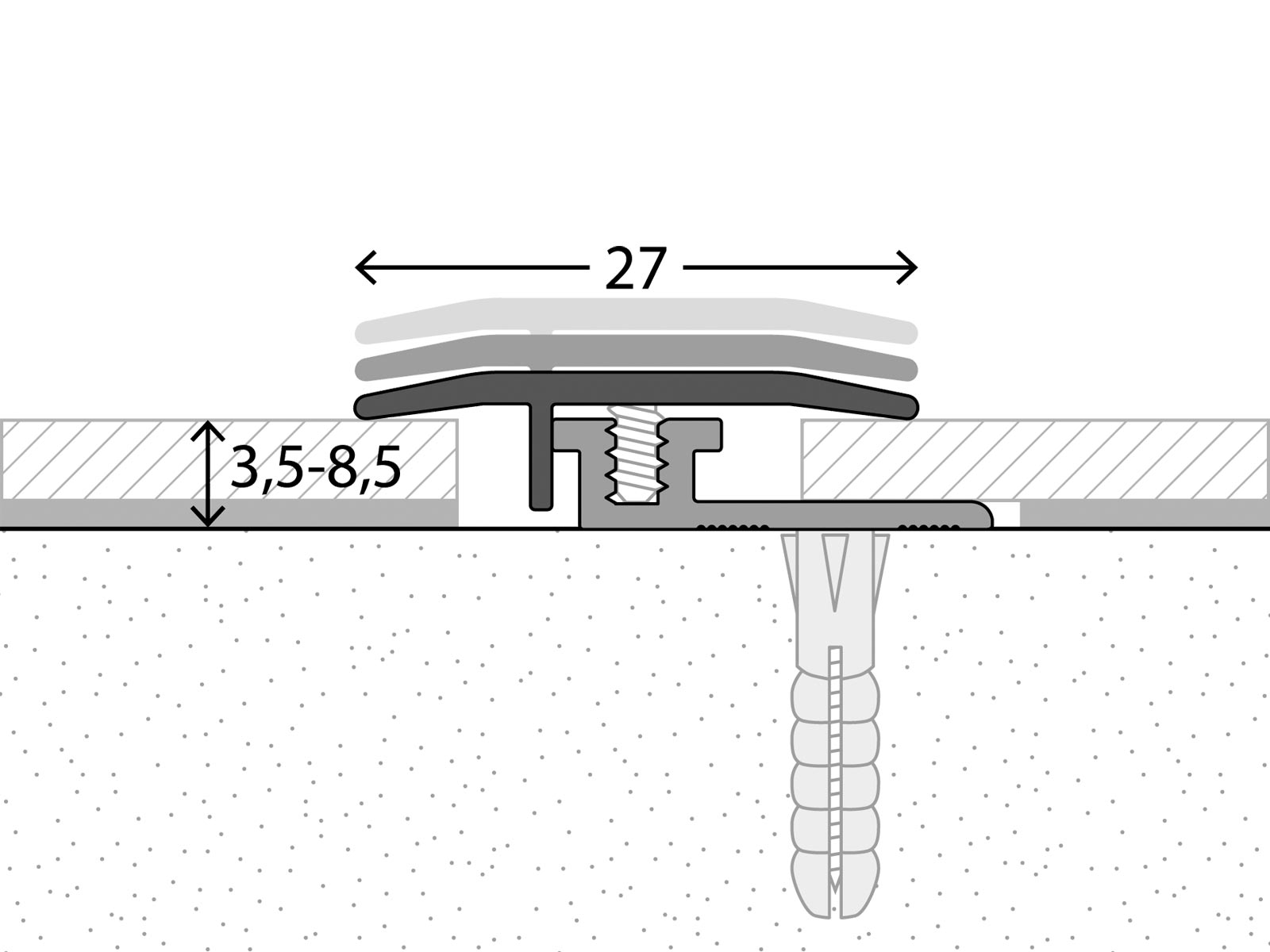 Nach der Befestigung des Basisprofils auf dem Untergrund erfolgt die Verlegung des Bodenbelages. Mit den beigefügten Schrauben wird das Oberprofil anschließend im Schraubkanal befestigt. Fertig. Die schmalen, flachen Profile überzeugen durch eine perfekte Optik und bieten gleichzeitig großzügige Dehnungsfugen für die Dimensionsschwankungen des Bodenbelages.