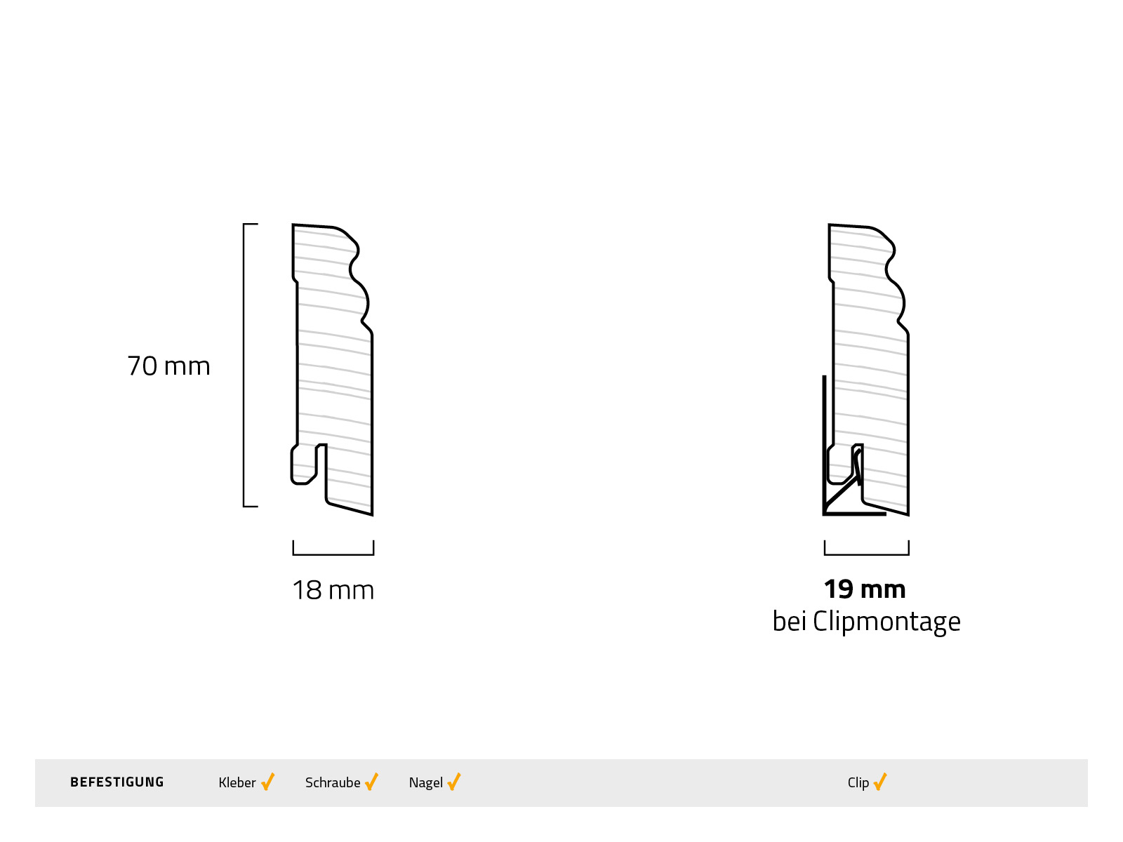 Haben wir noch etwas vergessen? Ah ja stimmt, die Montage! Wenn Du störende Spalträume im Handumdrehen beseitigen willst, schaust Du am besten in unseren „Sockelleisten anbringen - Methodenübersicht“ Ratgeber. Dort findest Du eine Übersicht aller Methoden, der Vor- und Nachteile und genaue Anleitungen. Im How-To Ratgeber haben wir auch die typischen Fehler bei der Anbringung zusammengestellt, erzählen Dir alles über den Gehrungsschnitt und viele weitere, hilfreiche Texte / Videos.