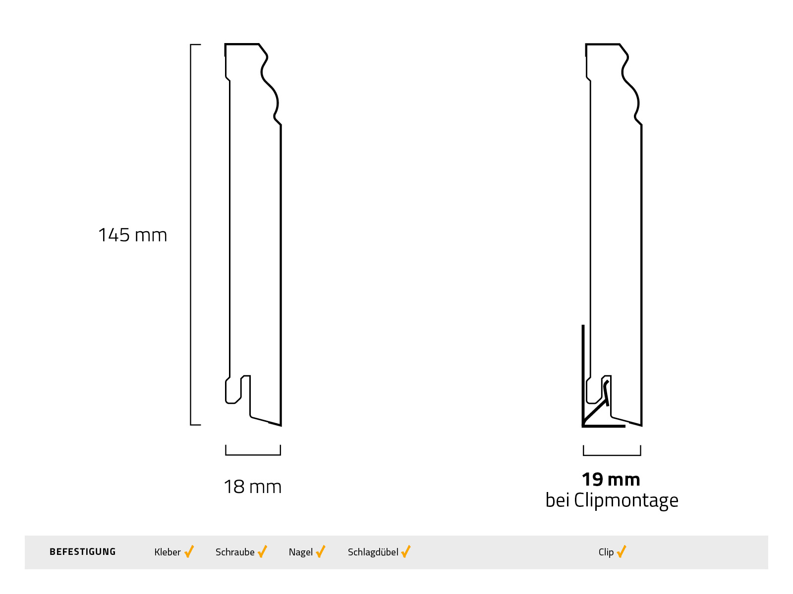 Haben wir noch etwas vergessen? Ah ja stimmt, die Montage! Wenn Du störende Spalträume im Handumdrehen beseitigen willst, schaust Du am besten in unseren „Sockelleisten anbringen - Methodenübersicht“ Ratgeber. Dort findest Du eine Übersicht aller Methoden, der Vor- und Nachteile und genaue Anleitungen. Im How-To Ratgeber haben wir auch die typischen Fehler bei der Anbringung zusammengestellt, erzählen Dir alles über den Gehrungsschnitt und viele weitere, hilfreiche Texte / Videos.