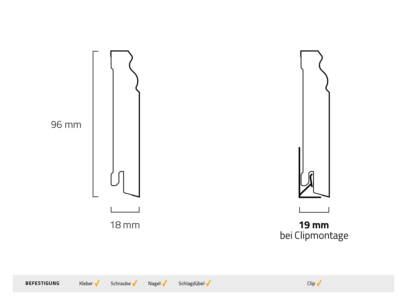 | Befestigungsart: | Clip, Kleber, Schlagdübel, Schraube |