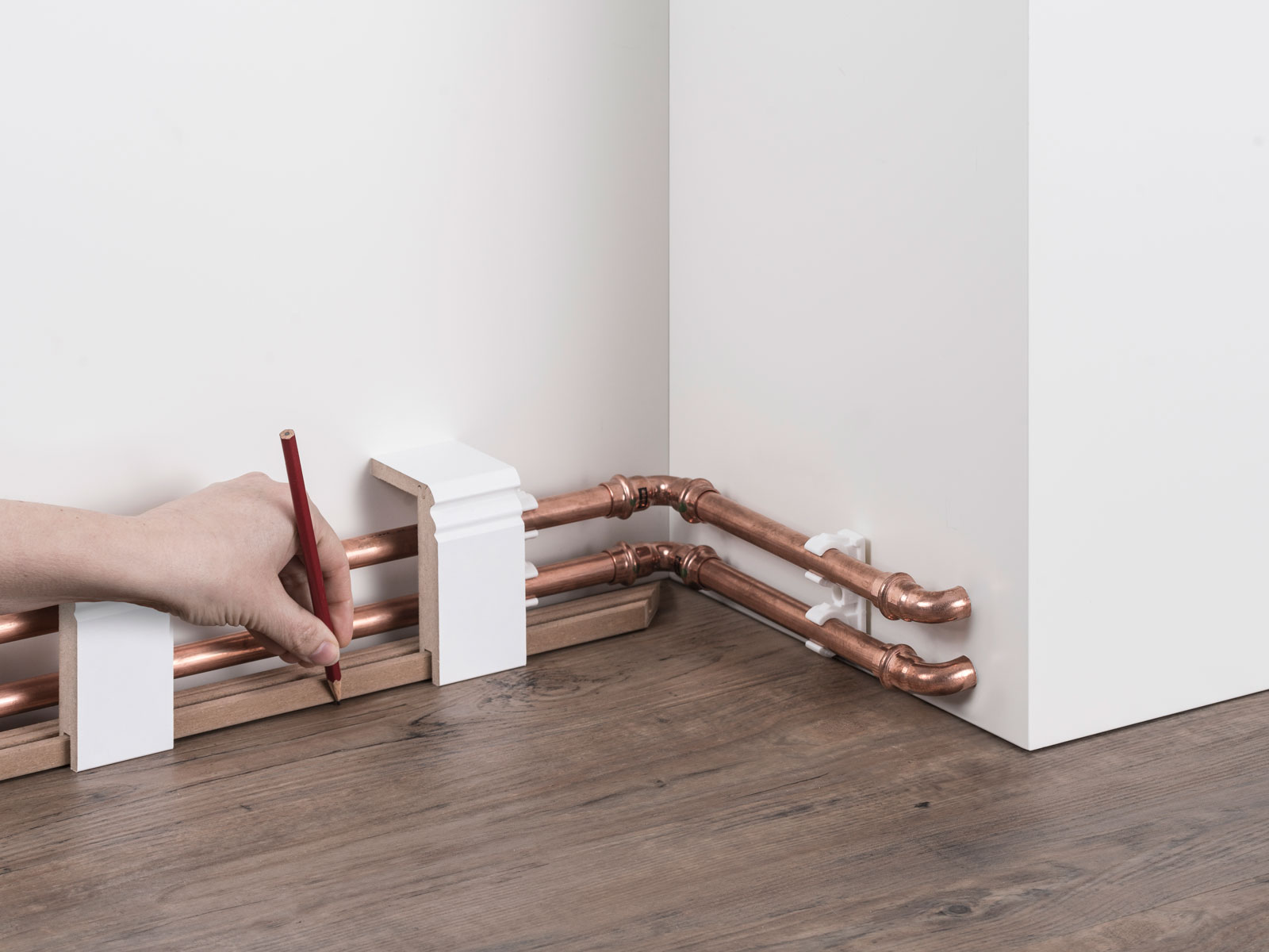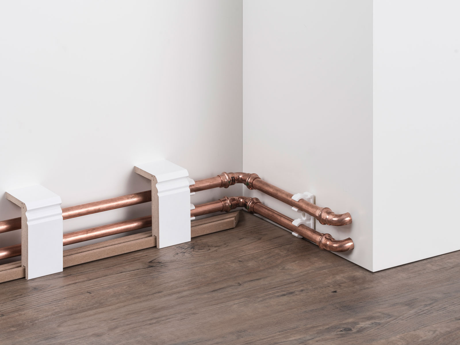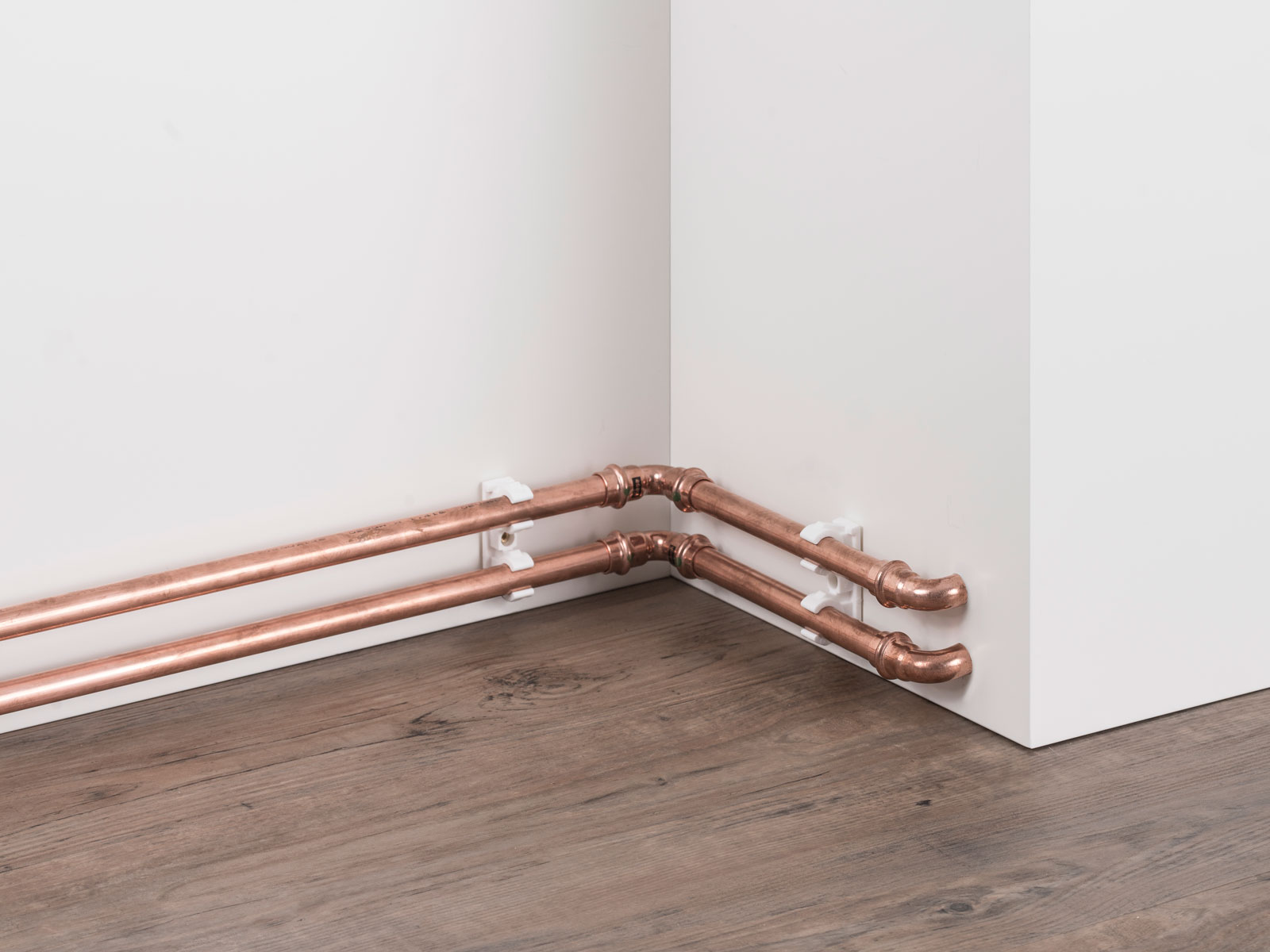 Für alle, die’s gern einheitlich mögen: Die Sockelleiste weiß 19 x 96 mm passt nicht nur optisch perfekt zur Rohrverkleidung, sondern lässt sich direkt anschließen – gleiche Höhe, gleiche Oberfläche, keine Brüche im Gesamtbild. So läuft die Leiste einfach weiter, wenn keine Rohre mehr da sind.