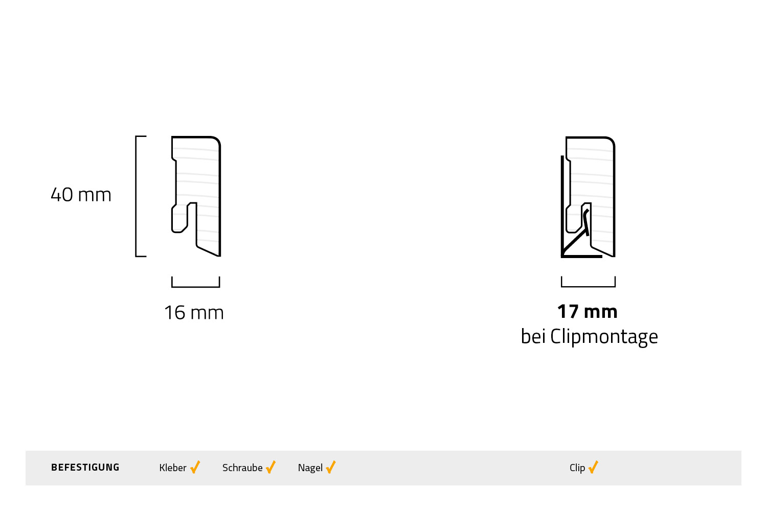 Alle Varianten kommen mit 16 mm Stärke und einer Länge von 2.400 mm. Das macht sie einfach zu montieren, egal ob du klebst, schraubst oder klippst. Und das Ergebnis? Sieht immer hochwertig aus – und fühlt sich auch so an.