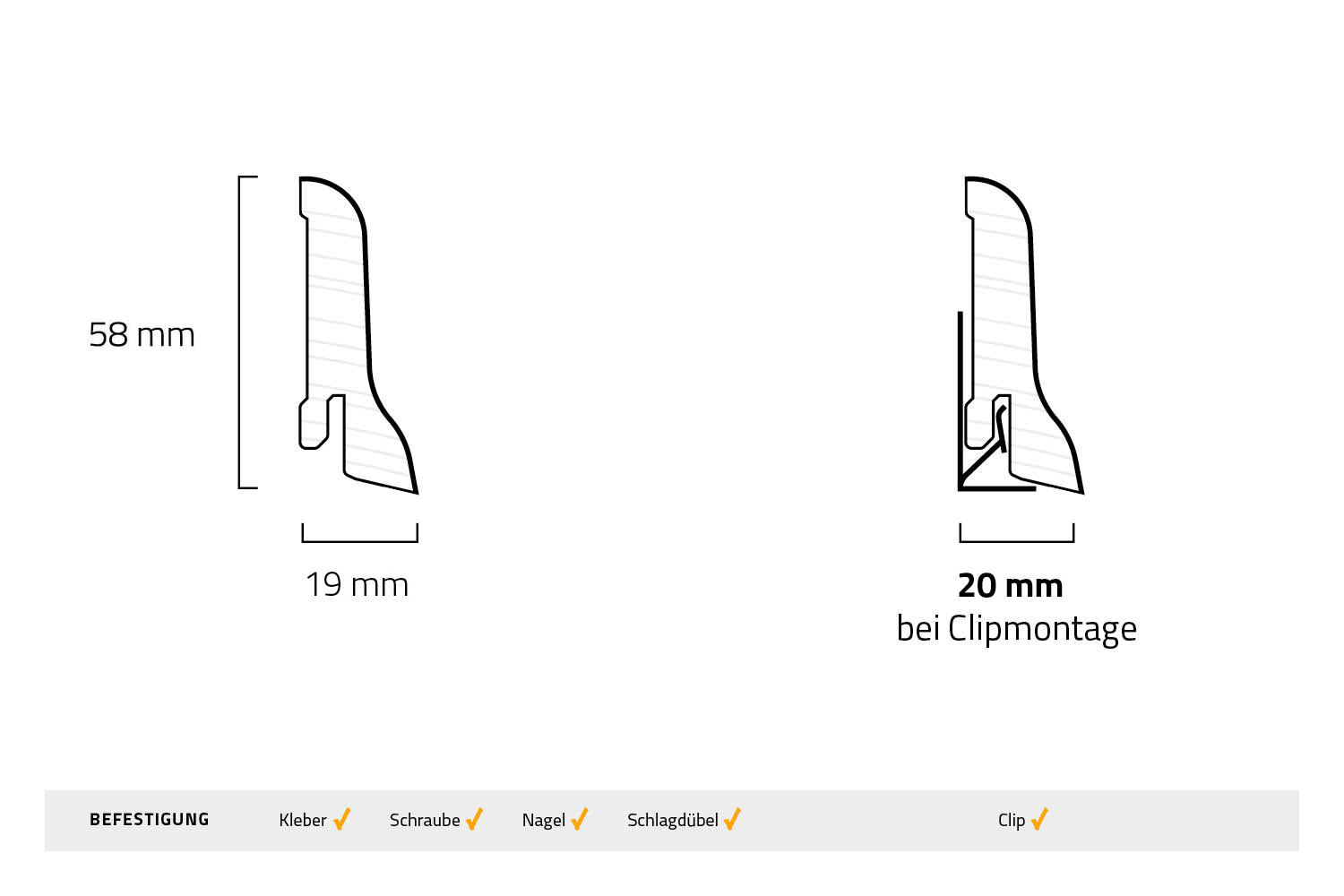 Je nachdem, wie viel Höhe du brauchst, bekommst du diese Sockelleiste in zwei Varianten: mit 19 x 42 mm oder 19 x 58 mm – beide jeweils 2.400 mm lang. Damit kannst du genau auf deine Raumhöhe oder deinen Stil abstimmen. Im Kern steckt massives Fichtenholz, was der Leiste Stabilität und Formtreue verleiht. Das Eiche-Furnier sorgt für die edle Optik, während die naturgetreue Klarlack-Beschichtung das Holz schützt, ohne es zu verstecken. Eine durchdachte Kombination aus Funktion, Qualität und natürlichem Look – ganz ohne unnötigen Schnickschnack.