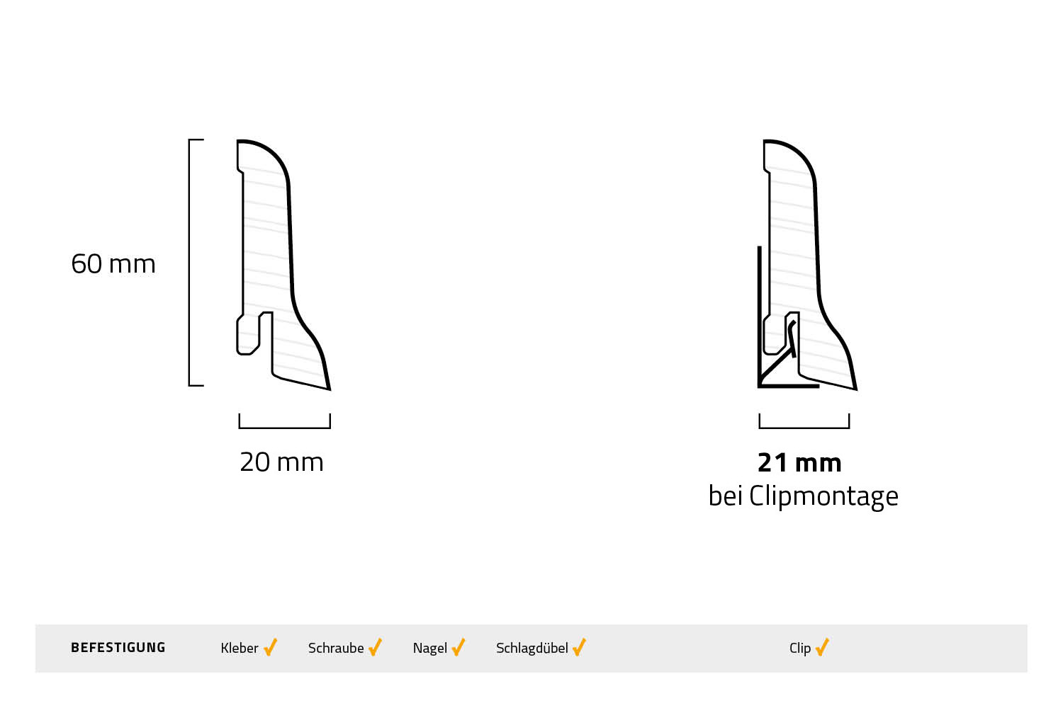 Du magst es lieber klassisch, willst deinem Zuhause optisch aber dennoch etwas Schwung verleihen? On top erwartest du hochwertige Qualität und ein super Preis-Leistungs-Verhältnis? Wo andere längst abgewunken hätten, kommen wir ins Geschäft. Oder besser gesagt, senden wir dir die perfekt zu deinem individuellen Vorhaben passende Sockelleisten direkt nach Hause. Nur die Montage überlassen wir ganz allein dir. Aber auch das sollte kein Problem für dich sein, klappt das mithilfe von Clips, Montagekleber oder Schrauben doch im Handumdrehen.