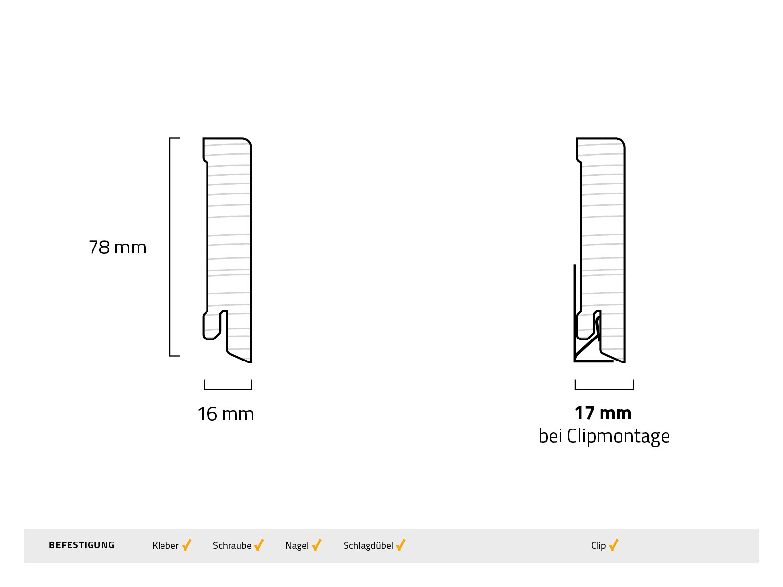 Unsere „Modern“ Sockelleisten aus Kiefer Massivholz sind in verschiedenen Größen erhältlich. Die 40 mm Variante eignet sich besonders für kleinere Räume oder wenn du einen dezenten Abschluss bevorzugst. Mit den 58 mm und 78 mm Leisten hast du die perfekte Wahl für mittelgroße bis große Räume, je nachdem, wie markant du den Übergang von Boden zu Wand gestalten möchtest. Die 95 mm Sockelleiste setzt ein kraftvolles Statement in Räumen mit hohen Decken oder großzügigen Flächen und unterstreicht die elegante Optik hochwertiger Bodenbeläge.