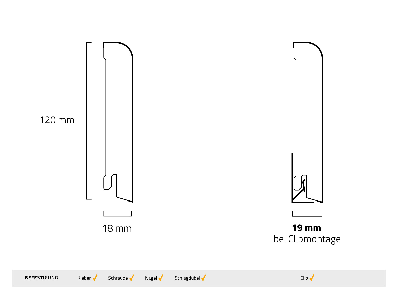 Um sicherzustellen, dass du für jedes Projekt die passende Größe findest, bieten wir die „Oben rund“ Sockelleisten in verschiedenen Maßen an. Die 18 x 58 mm Variante ist ideal für kleinere Räume oder Räume mit niedrigen Decken und sorgt für einen dezenten Abschluss. Die 18 x 78 mm Leiste eignet sich perfekt für mittelgroße Räume, da sie einen etwas markanteren Abschluss bietet, ohne aufdringlich zu wirken. Für größere Räume oder solche mit höheren Decken bietet sich die 18 x 100 mm Variante an, die ein starkes gestalterisches Statement setzt. Und für besonders hohe Räume oder Altbauten sorgt die 18 x 120 mm Sockelleiste für eine luxuriöse Note und einen eleganten Übergang zwischen Wand und Boden. Mit dieser Auswahl an Größen hast du die maximale Flexibilität, um jede Raumgestaltung perfekt abzurunden.