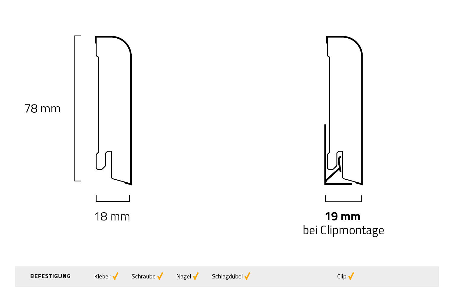 Um sicherzustellen, dass du für jedes Projekt die passende Größe findest, bieten wir die „Oben rund“ Sockelleisten in verschiedenen Maßen an. Die 18 x 58 mm Variante ist ideal für kleinere Räume oder Räume mit niedrigen Decken und sorgt für einen dezenten Abschluss. Die 18 x 78 mm Leiste eignet sich perfekt für mittelgroße Räume, da sie einen etwas markanteren Abschluss bietet, ohne aufdringlich zu wirken. Für größere Räume oder solche mit höheren Decken bietet sich die 18 x 100 mm Variante an, die ein starkes gestalterisches Statement setzt. Und für besonders hohe Räume oder Altbauten sorgt die 18 x 120 mm Sockelleiste für eine luxuriöse Note und einen eleganten Übergang zwischen Wand und Boden. Mit dieser Auswahl an Größen hast du die maximale Flexibilität, um jede Raumgestaltung perfekt abzurunden.