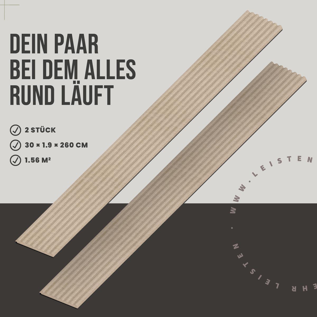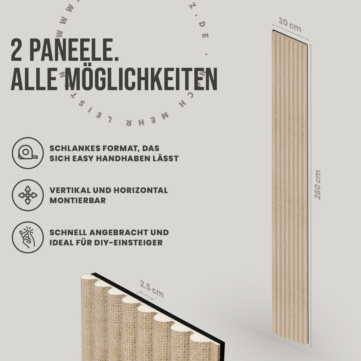 Das 2er Set besteht aus zwei Paneelen im Format 30 x 260 cm und deckt insgesamt 1,56 m² Wandfläche ab. Die Akustikpaneele lassen sich vielseitig einsetzen – von dezenten Akzentwänden bis hin zu größeren Wandflächen. Die PEFC-Zertifizierung (PEFC/04-31-0664) unterstreicht den Anspruch an nachhaltige Materialien und langlebige Qualität.