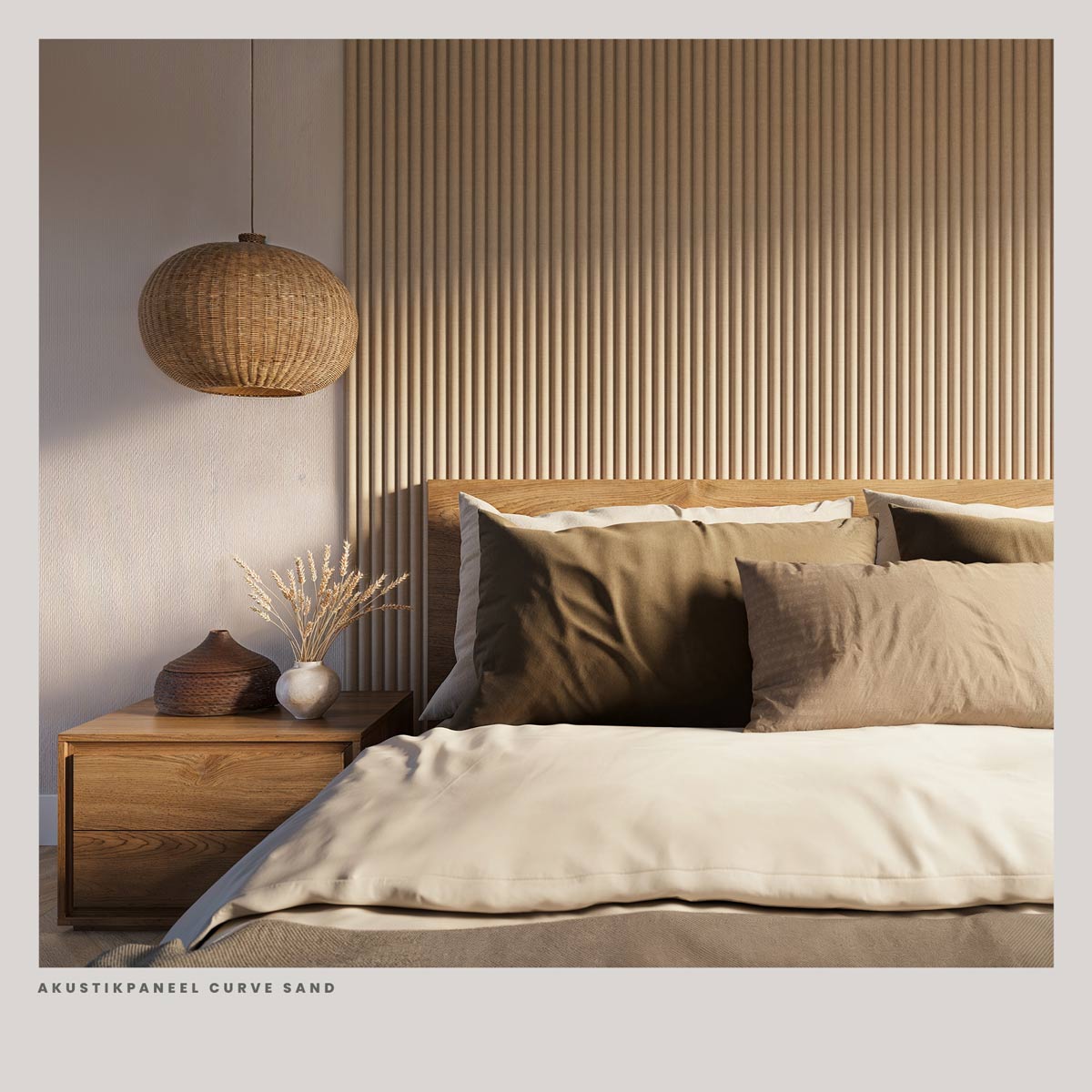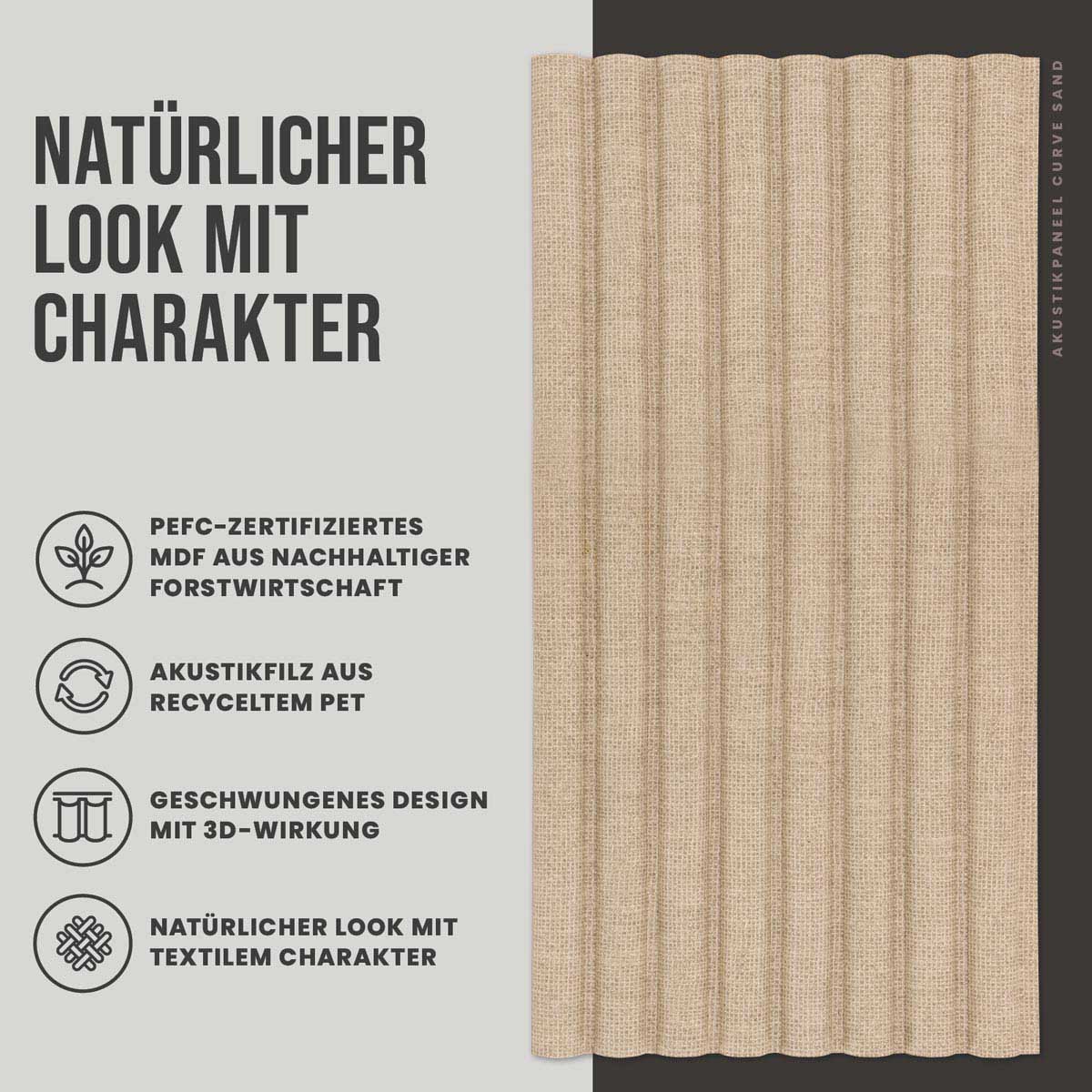 Die geschwungene Form der Lamellen erzeugt einen dezenten 3D-Effekt, der je nach Lichteinfall unterschiedlich wahrgenommen wird. Gleichzeitig sorgt der Materialaufbau aus MDF mit Filzrückseite dafür, dass Schall aufgenommen und der Nachhall im Raum reduziert wird. Das Ergebnis ist eine angenehm ruhige Akustik, die sich besonders in Wohn- und Schlafräumen positiv bemerkbar macht.