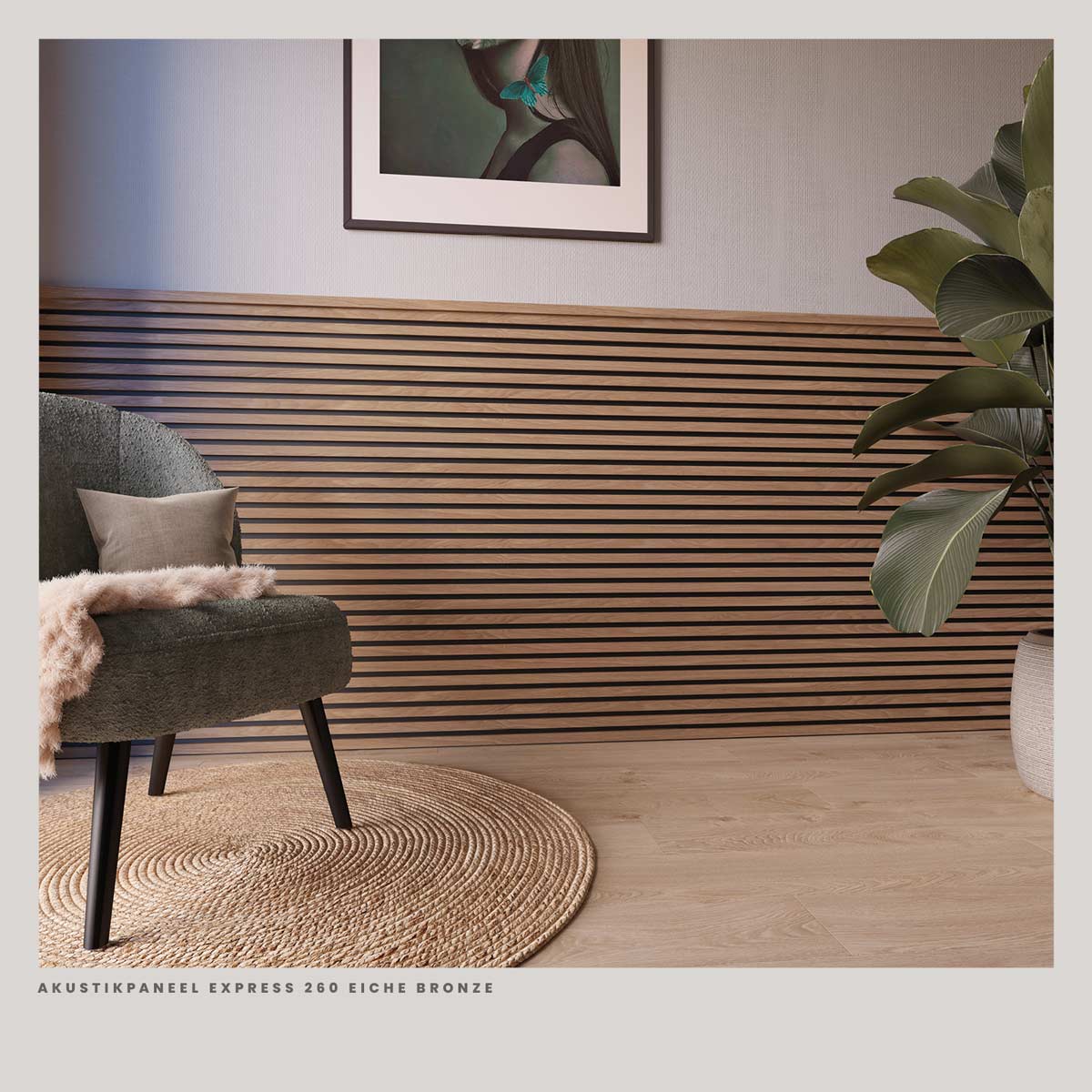 Mit den Maßen 1,8 × 2,2 × 260 cm ist die Abschlussleiste exakt auf Akustikpaneele im Format 30 × 1,7 × 260 cm abgestimmt. Die warme Oberfläche in Eiche Bronze greift die Optik der Paneele auf und unterstützt eine klare, durchgehende Linienführung.