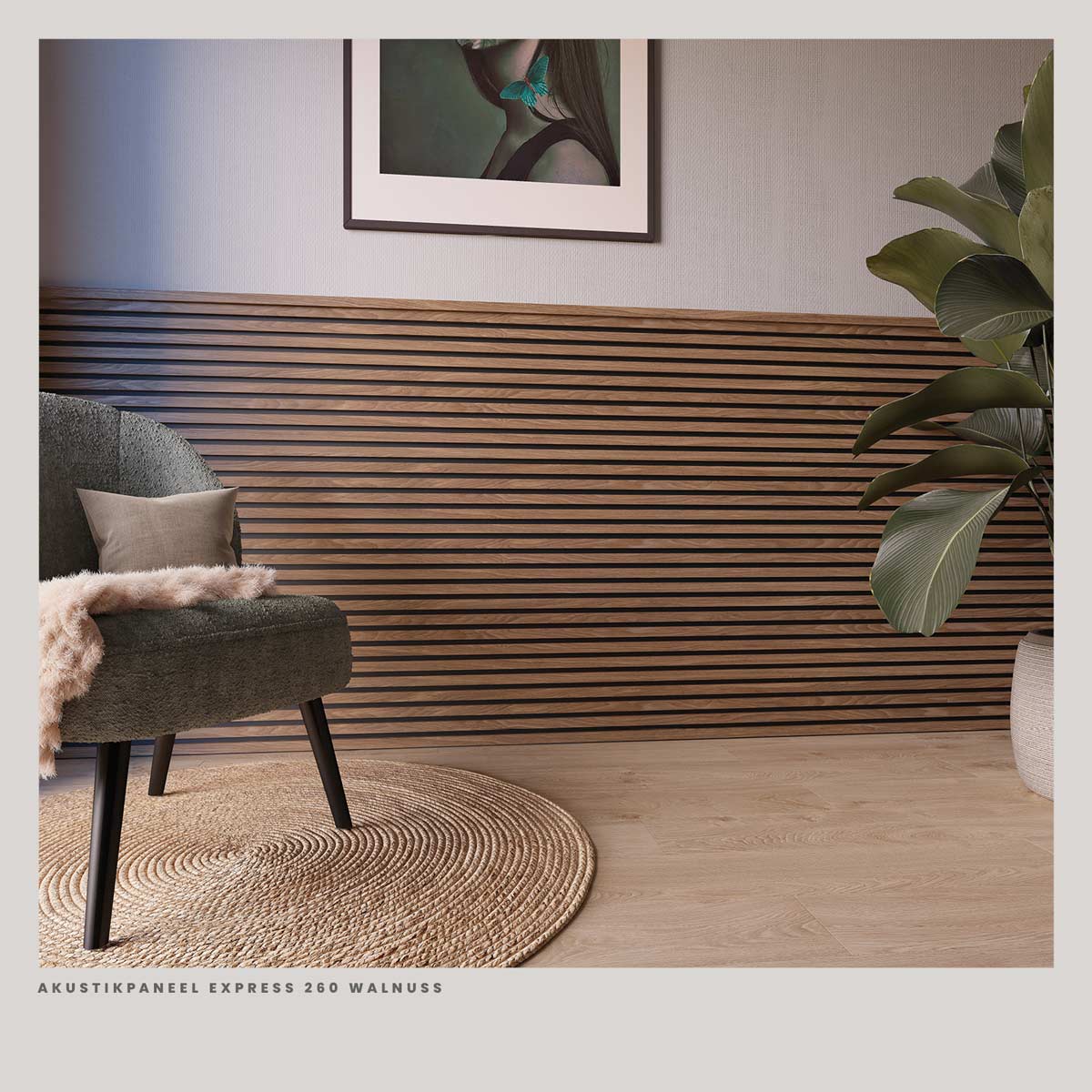 Die Abschlussleiste für die Akustikpaneele in Walnuss ist die passende Ergänzung für einen sauberen und stimmigen Wandabschluss. Die warme Walnussoptik ist exakt auf die Oberfläche der Paneele abgestimmt und sorgt für ein geschlossenes, professionelles Gesamtbild.