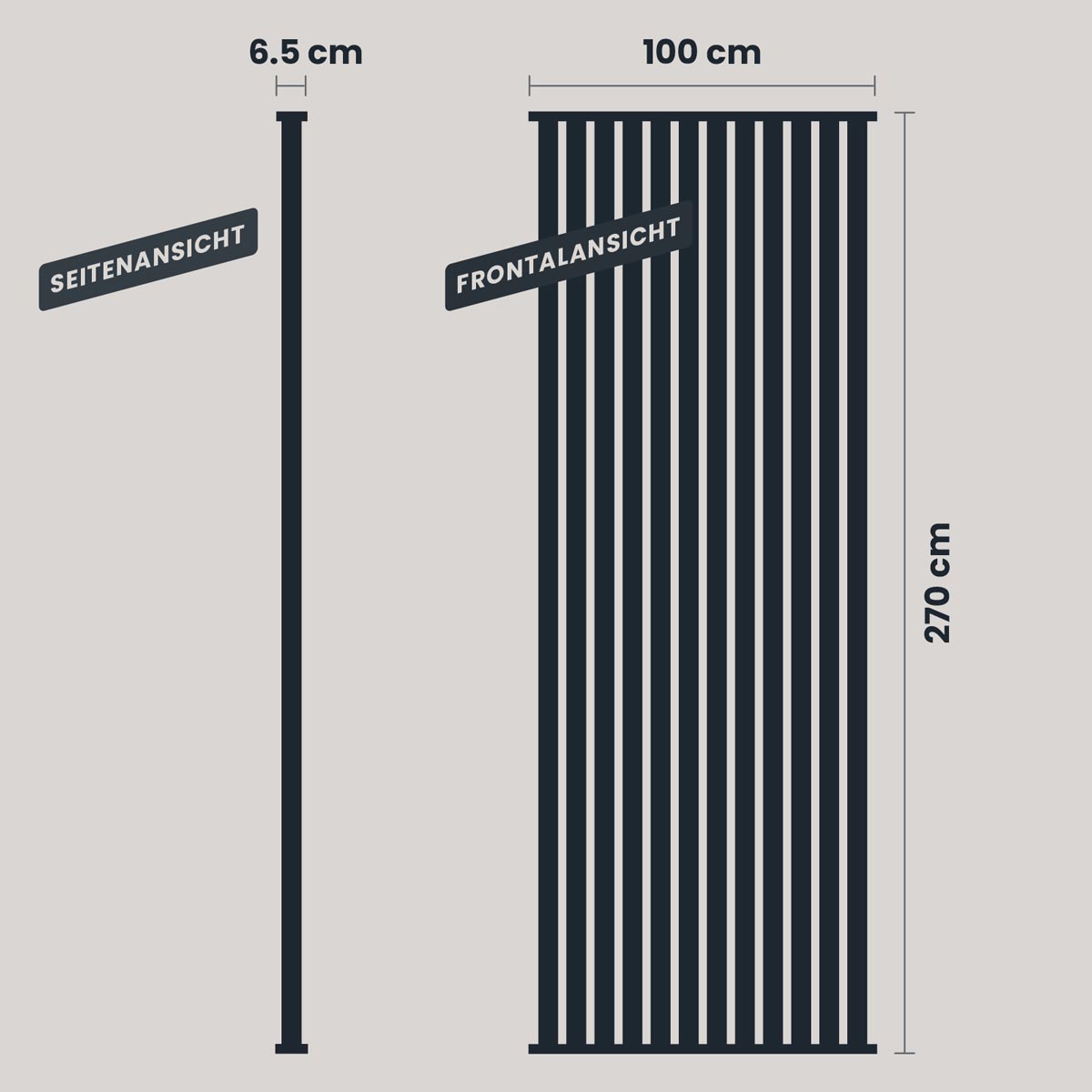 Jede Lamelle ist 270 cm lang und kann bei Bedarf einfach gekürzt werden. Gefertigt aus MDF mit folierter Oberfläche und PEFC-zertifiziertem Holz überzeugt das Raumteiler-Set durch Langlebigkeit, eine pflegeleichte, UV-beständige Oberfläche sowie ein modulares System, das sich flexibel erweitern und an Deine Wohnsituation anpassen lässt.