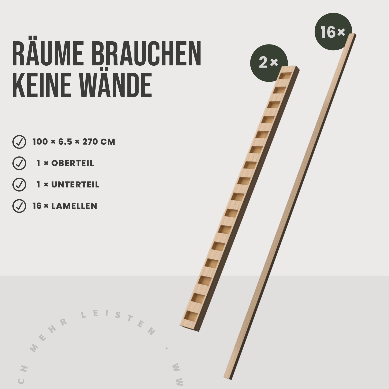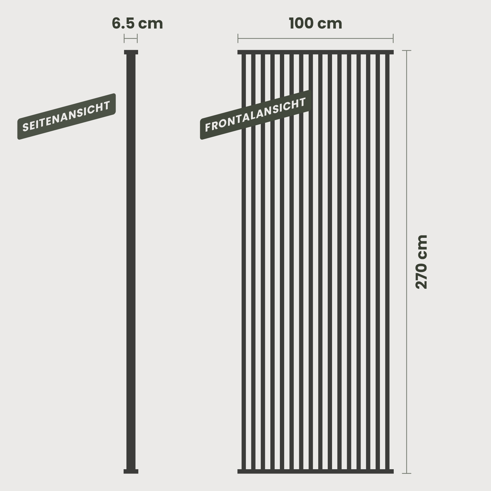 Jede Lamelle ist 270 cm lang und kann bei Bedarf einfach gekürzt werden. Gefertigt aus MDF mit folierter Oberfläche und PEFC-zertifiziertem Holz überzeugt das Raumteiler-Set durch Langlebigkeit, eine pflegeleichte, UV-beständige Oberfläche und ein modulares System, das sich flexibel erweitern lässt.