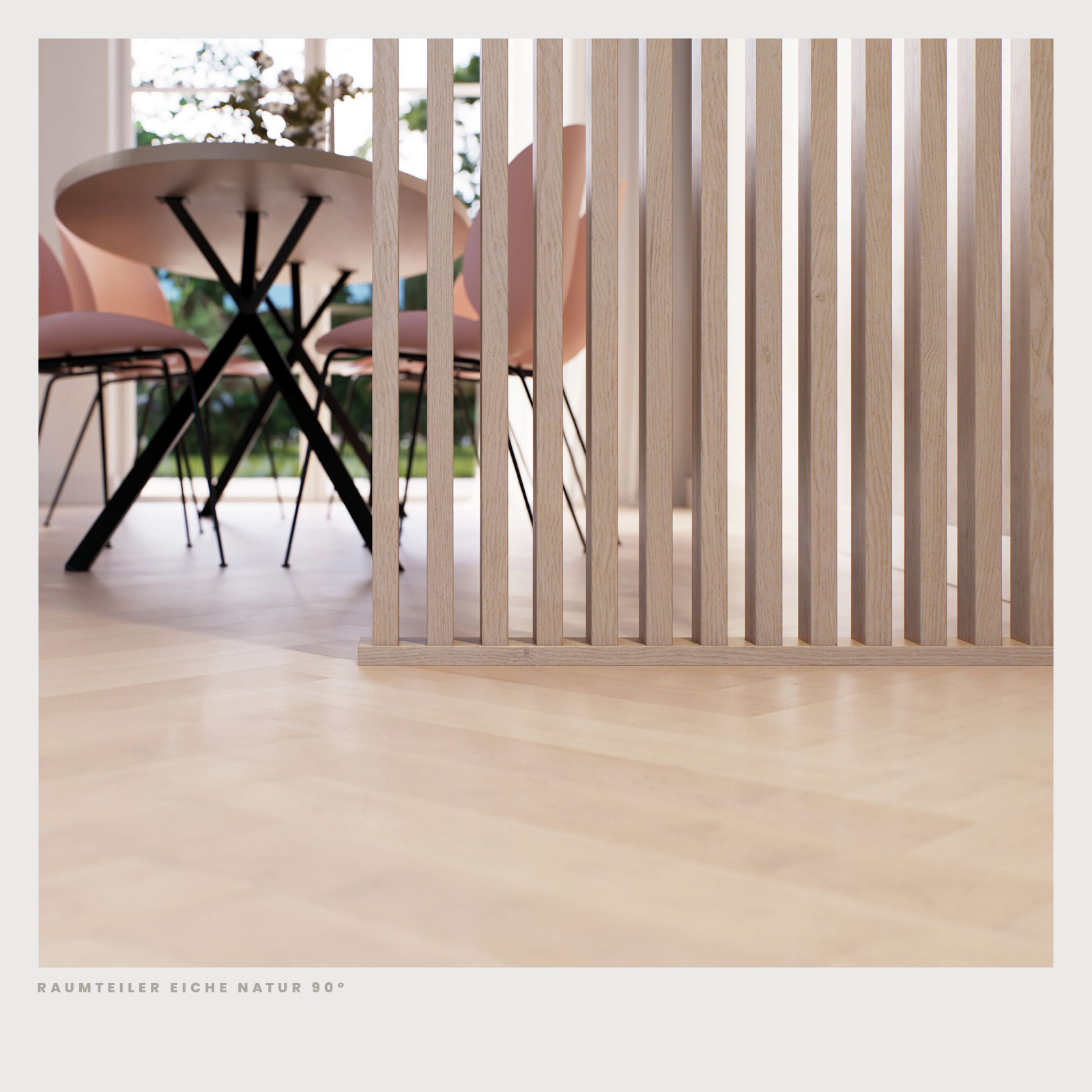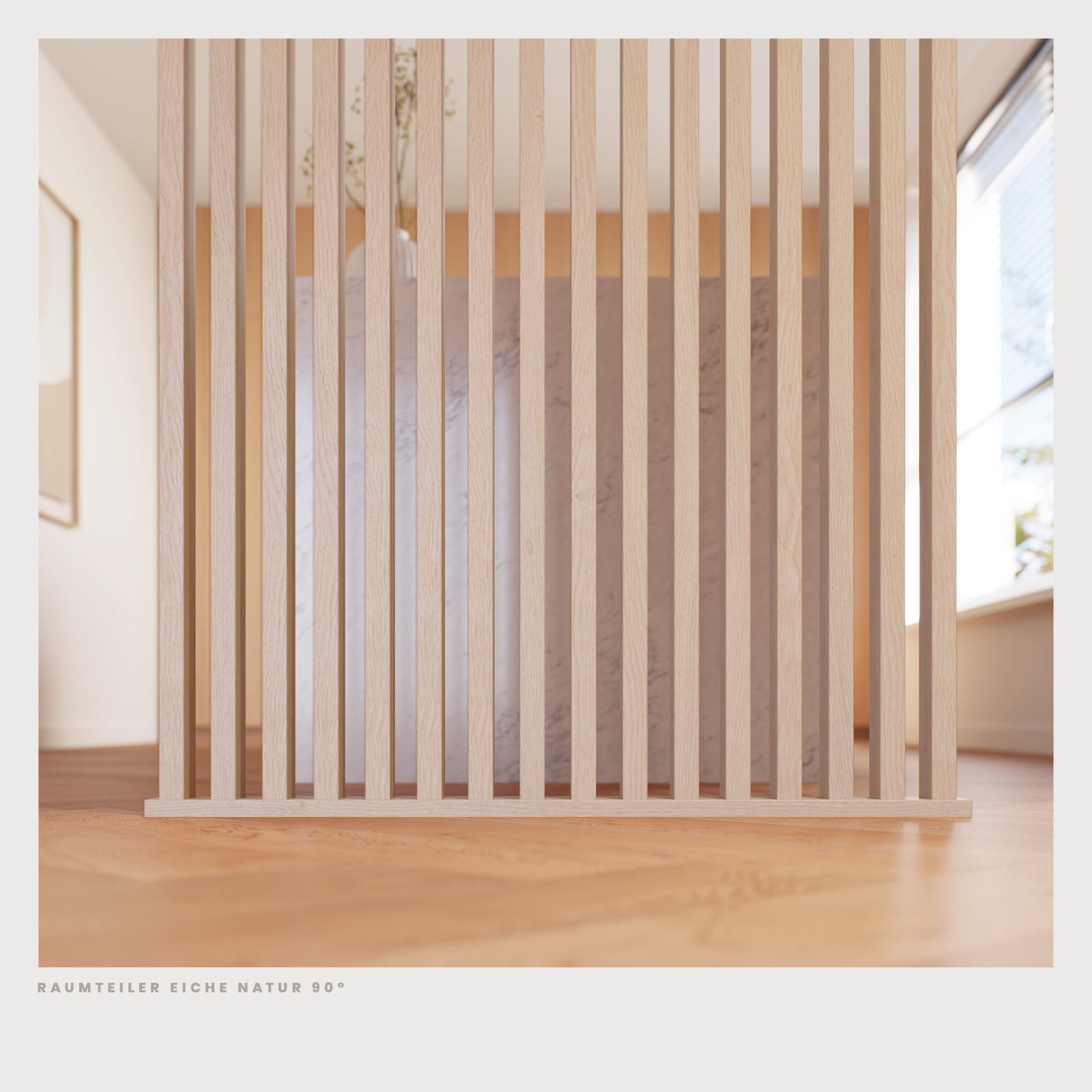 Die vertikal angeordneten Lamellen gliedern den Raum sichtbar, ohne ihn vollständig zu schließen. Tageslicht kann weiterhin frei durch den Raum fließen, während gleichzeitig ein dezenter Sichtschutz entsteht. Die Oberfläche in Eiche Natur bringt Wärme und Natürlichkeit in den Raum und fügt sich mühelos in moderne, skandinavische oder zeitlose Einrichtungskonzepte ein.