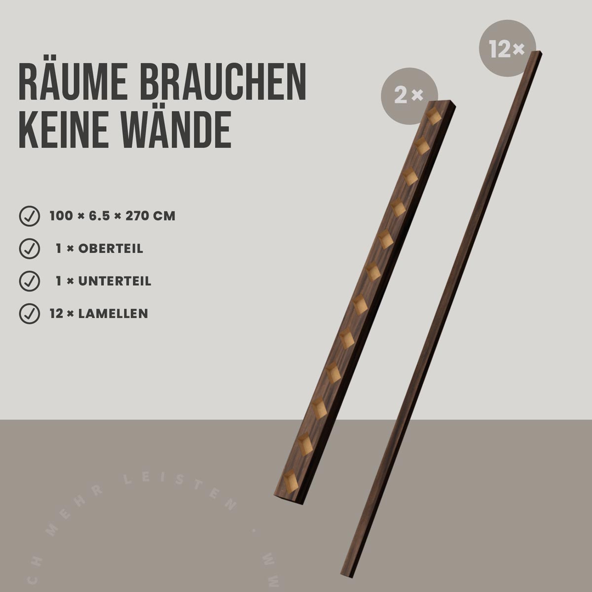 Mit diesem Raumteiler-Set gestaltest Du Deine Räume flexibel, zeitgemäß und zugleich wohnlich. Die Kombination aus Ober- und Unterteil in 45°-Ausführung und drei aufeinander abgestimmten Lamellen-Sets bietet Dir eine durchdachte Komplettlösung für offene und klar strukturierte Wohnbereiche. Die versetzte 45°-Lamellenanordnung erzeugt eine lebendige Optik und verleiht dem Raum Tiefe, ohne ihn dominant wirken zu lassen.