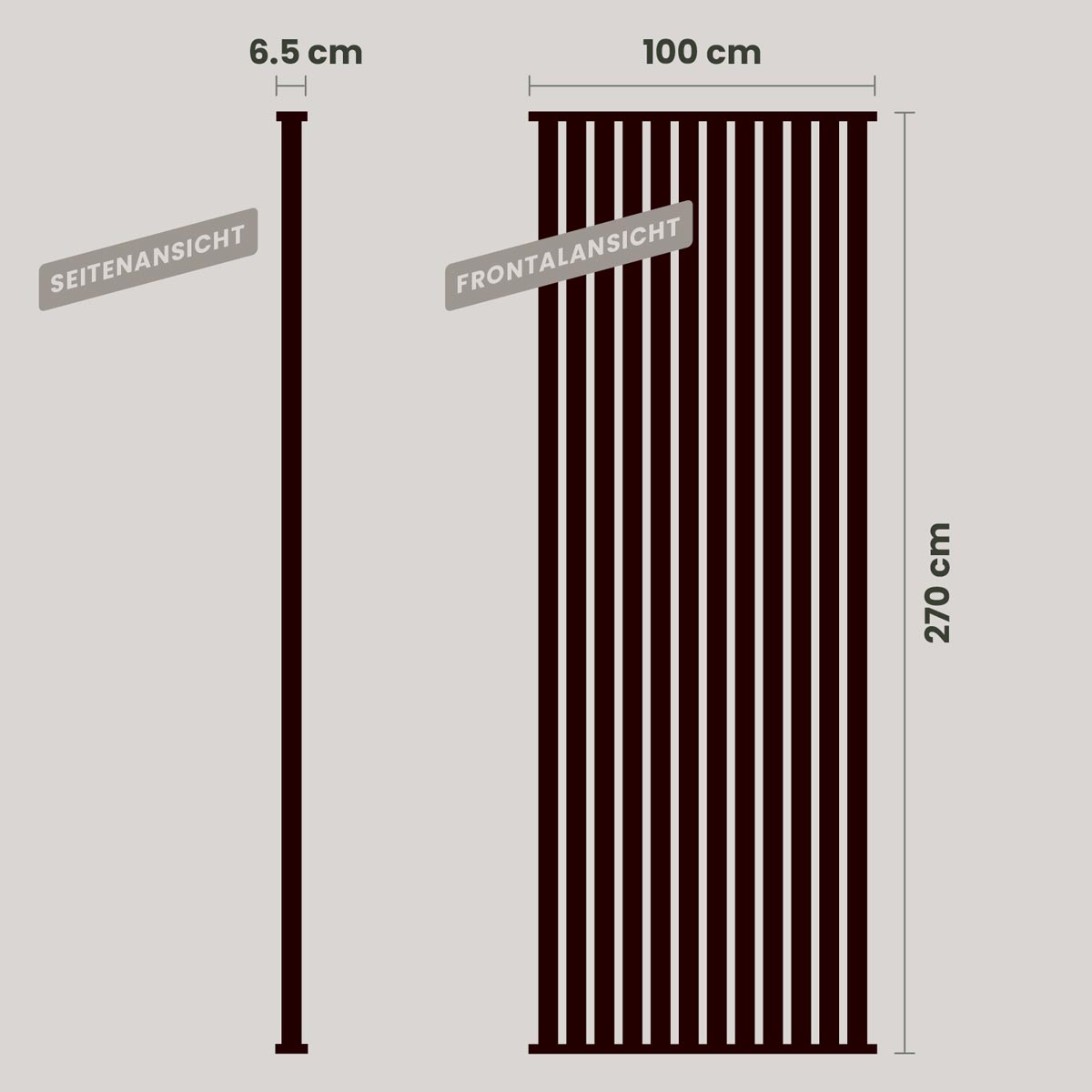 Jede Lamelle ist 270 cm lang und lässt sich bei Bedarf unkompliziert kürzen. Gefertigt aus MDF mit folierter Oberfläche und PEFC-zertifiziertem Holz überzeugt das Raumteiler-Set durch Langlebigkeit, eine pflegeleichte und UV-beständige Oberfläche sowie ein modulares System, das sich flexibel erweitern und anpassen lässt.