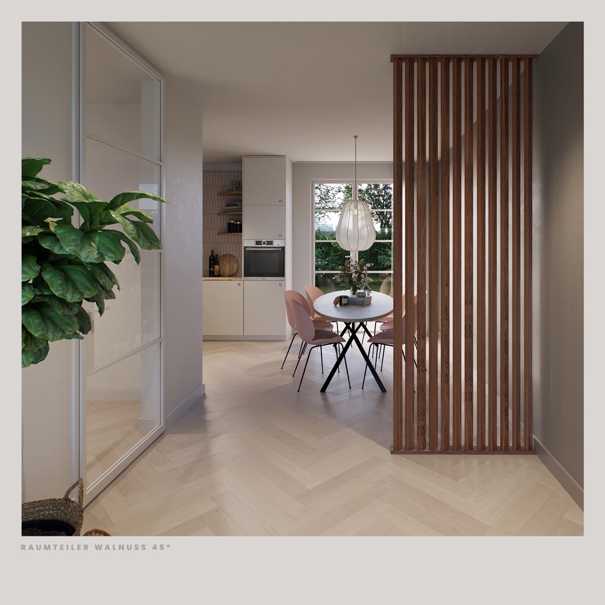 Die vertikal angeordneten Lamellen gliedern den Raum auf natürliche Weise, ohne ihn vollständig zu trennen. Licht bleibt weiterhin frei im Raum beweglich, während gleichzeitig ein dezenter Sichtschutz entsteht. Die Oberfläche in Walnuss bringt Wärme und Eleganz in den Raum und erzeugt – abhängig vom Lichteinfall – ein harmonisches Zusammenspiel aus Licht und Schatten. So fügt sich der Raumteiler nahtlos in moderne, skandinavische oder zeitlos gestaltete Wohnkonzepte ein.